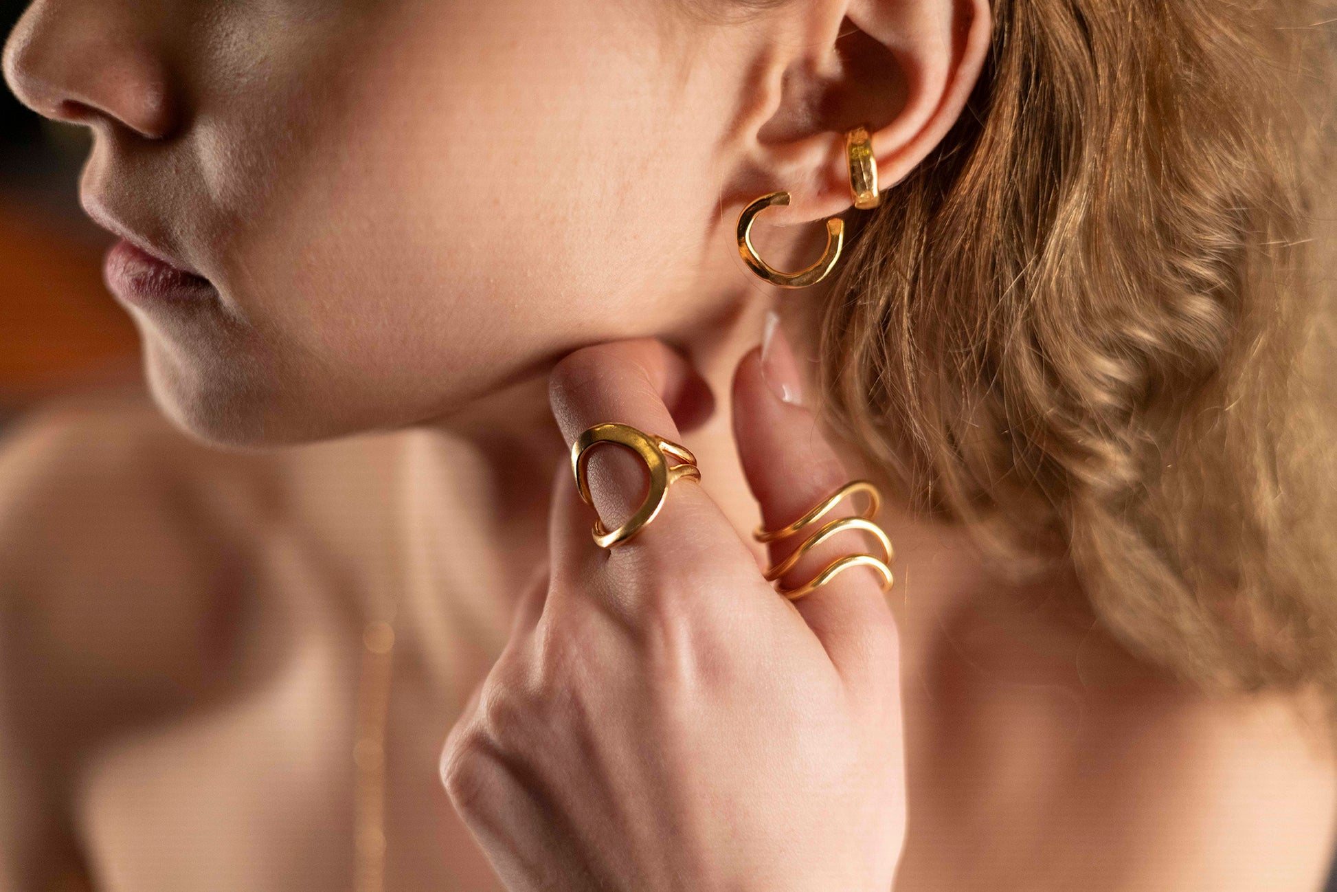 Handcrafted sculptural hoops that curve gently behind the ear. Minimal, modern, and lightweight — perfect for the contemporary woman balancing work and style.